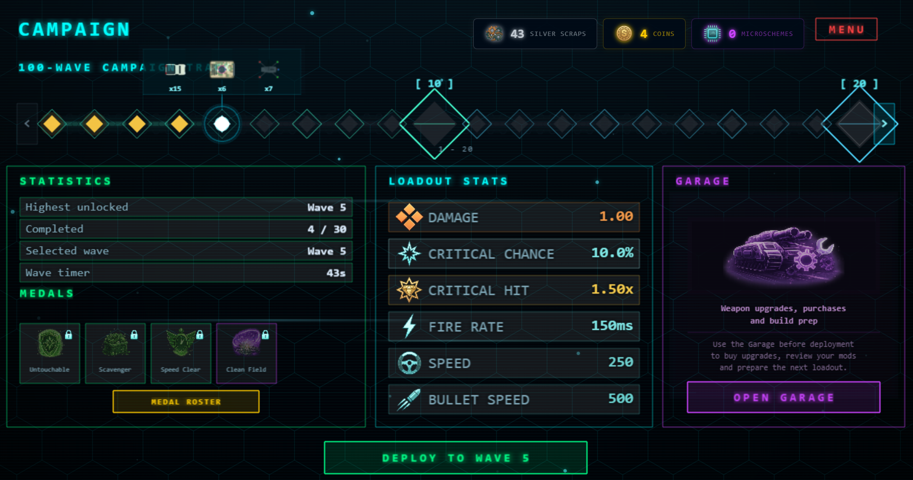 - 30 waves with different enemies and mechanics;